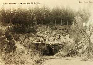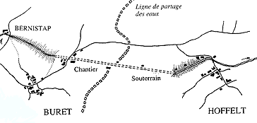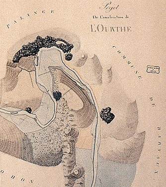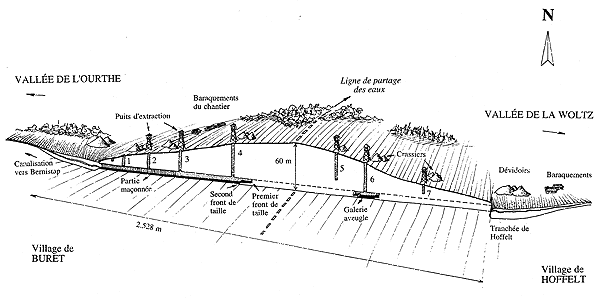 | Impossible d'entailler le massif rocheux sur une telle hauteur : le percement d'une galerie souterraine, solution avancée par l'auteur de projet, R. De Puydt, est révolutionnaire (pour nos régions). Elle permettra de relier les deux sources au mètre près et d'établir, pour la première fois, une communication navigable entre les deux grands bassins fluviaux. | ||||||||||||||||||||||||||||||||||||||||||||||||||||||||||||